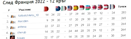 futbolist4eto_10 води в класирането и след този кръг. На втора позиция излиза cherub, а третата се дели между petyokirkov и Marsden още ...
