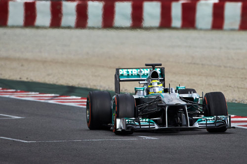 Нико Розберг с Мерцедес записа най-бързото време в първият ден от тестовете на пистата Каталуния тази година. След него се наредиха Кими Райконен с Лотус и Фернандо Алонсо с Ферари. Първите трима използваха гуми Медиум, когато записаха най-добрите си времена в края на теста.