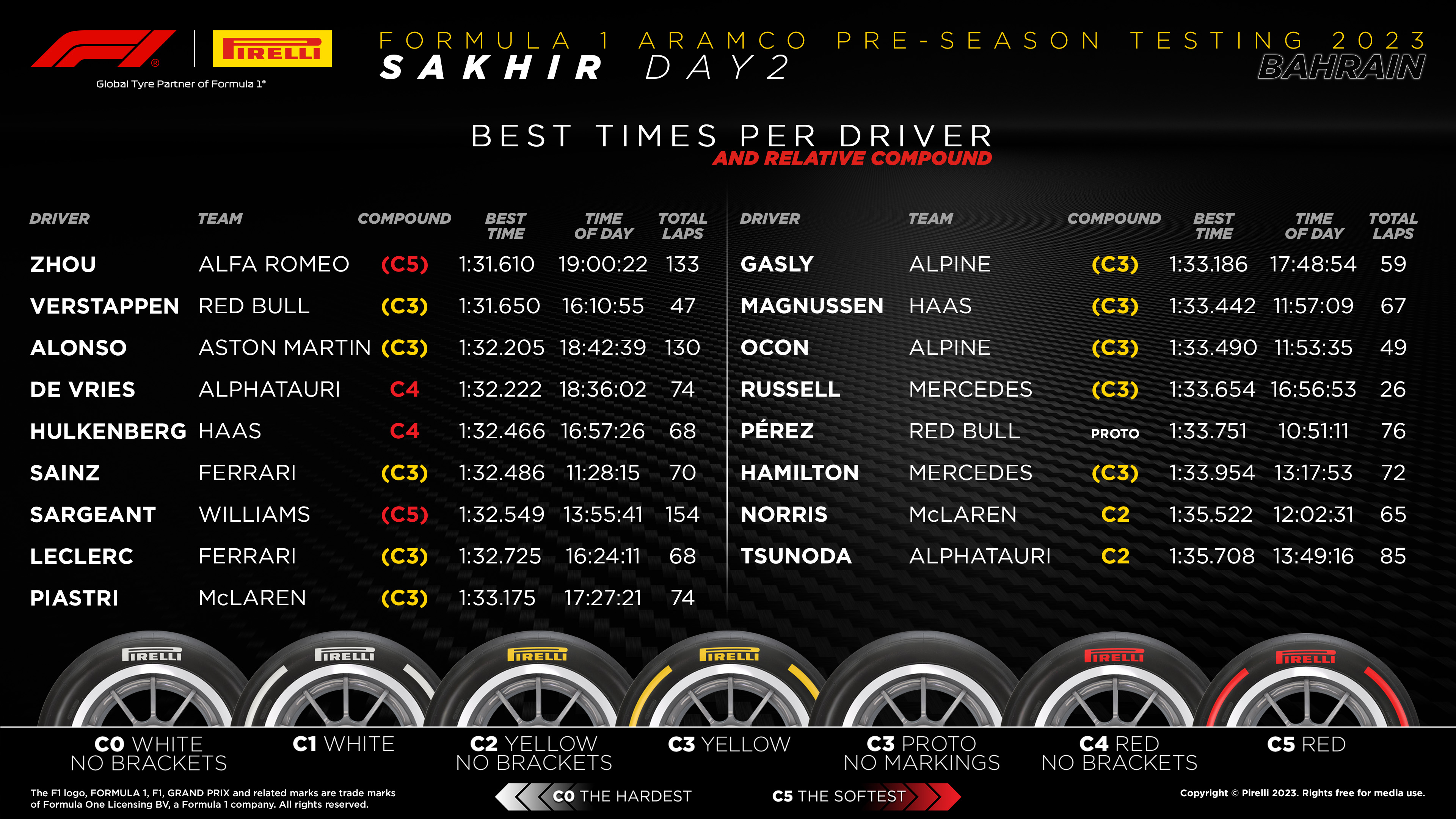 08:49 - добро утро на всички 08:49 - време е за втория ден тестове преди началото на сезон 2023 08:49 - графика за днес - https://f1.f-e-n.net/index.php/url293206 09:00 - зелен флаг 09:00 - започва теста днес - Алонсо е първи на пистата, следван от Жоу и Норис 09:00 - Сайнц също напусна бокса 09:03 - 1: Сайнц вече е най-бърз с 1:38.225 в обиколка 3 - гуми p 09:04 - :: Цунода подобрява времето си на 1:45.329 и вече е на втора позиция в обиколка 3 - гуми Медиум 09:05 - :: Окон записва 1:39.582 и заема втора позиция в обиколка 3 - гуми Медиум 09:05 - :: само една обиколка с време за Сайнц - 60:0.000 - гуми p 09:06 - :: Перес записва 1:39.466 и заема втора позиция в обиколка 3 - гуми p 09:06 - :: Окон записва 1:38.344 и заема втора позиция в обиколка 4 - гуми Медиум 09:07 - 1: Сайнц с най-бърза обиколка - 1:37.248 в обиколка 5 - гуми p 09:08 - както винаги сутрешната сесия започва с аеро тестове 09:08 - на болидите има големи матрици с аеро датчици 09:10 - :: Цунода сега прави 1:44.126 и вече е на четвърта позиция в обиколка 6 - гуми Медиум 09:12 - :: Хамилтън с 1:38.167 на втора позиция в обиколка 3 - гуми Медиум 09:13 - Хамилтън беше доста време извън пистата в последната си обиколка 09:14 - :: Хамилтън с 1:37.886 на втора позиция в обиколка 4 - гуми Медиум 09:15 - :: Хамилтън с 1:37.544 на втора позиция в обиколка 5 - гуми Медиум 09:16 - :: Цунода с 1:43.615 на пета позиция в обиколка 9 - гуми Медиум 09:17 - :: след две обиколки Хамилтън в бокса - 1:37.886, 1:38.167 - гуми Медиум 09:21 - с нови Медиум гуми Магусен прави сектори едно и две 09:21 - 1: Магнусен прави най-бързата обиколка до момента 1:33.710 в обиколка 4 - гуми Медиум 09:21 - с три сектора Магнусен начело с новите Медиум гуми 09:23 - :: само една обиколка с време за Магнусен - 60:0.000 - гуми Медиум 09:30 - :: Хамилтън подобрява времето си на 1:37.394 и вече е на трета позиция в обиколка 9 - гуми Медиум 09:30 - https://twitter.com/AlbertFabrega/status/1629017091192893442 09:30 - :: Алонсо подобрява времето си на 1:35.943 и вече е на втора позиция в обиколка 7 - гуми Медиум 09:31 - https://twitter.com/AstonMartinF1/status/1629014876952662019 09:31 - https://twitter.com/AlphaTauriF1/status/1629014641316622336 09:31 - https://twitter.com/AlbertFabrega/status/1629014370171645954 09:31 - https://twitter.com/AlbertFabrega/status/1629014114579226624 09:31 - :: Хамилтън записва 1:37.070 и заема трета позиция в обиколка 10 - гуми Медиум 09:31 - L: 10 обиколки за Хамилтън 09:32 - :: Алонсо направи само една обиколка с време - 60:0.000 - гуми Медиум 09:33 - :: след една обиколка за време Хамилтън се върна в бокса - 1:37.394 - гуми Медиум 09:35 - :: Сайнц подобрява времето си на 1:35.547 и вече е на втора позиция в обиколка 8 - гуми Медиум 09:40 - L: 10 обиколки за Сайнц 09:40 - нови Медиум за Окон сега 09:42 - :: Окон сега прави 1:35.500 и вече е на втора позиция в обиколка 10 - гуми Медиум 09:43 - L: 10 обиколки за Окон 09:44 - :: Перес записва 1:34.952 и заема втора позиция в обиколка 6 - гуми p 09:45 - :: след една обиколка за време Окон се върна в бокса - 60:0.000 - гуми Медиум 09:45 - L: 10 обиколки за Алонсо 09:46 - :: Жоу подобрява времето си на 1:36.206 и вече е на шеста позиция в обиколка 7 - гуми Медиум 09:46 - :: Окон подобрява времето си на 1:35.327 и вече е на трета позиция в обиколка 12 - гуми Медиум 09:47 - :: Алонсо записва 1:35.823 и заема пета позиция в обиколка 11 - гуми Медиум 09:48 - :: само една обиколка с време за Алонсо - 60:0.000 - гуми Медиум 09:49 - :: след две обиколки Окон в бокса - 1:35.500, 2:25.546 - гуми Медиум 09:49 - :: само една обиколка с време за Жоу - 60:0.000 - гуми Медиум 09:49 - L: 10 обиколки за Магнусен 09:51 - :: Перес сега прави 1:33.751 и вече е на втора позиция в обиколка 9 - гуми p 09:51 - прототипни гуми за Перес при този му опит и сектори едно и две, три е за Магнусен, който направи обиколка на 8 хилядни по-бавна от най-добрата му 09:53 - L:
