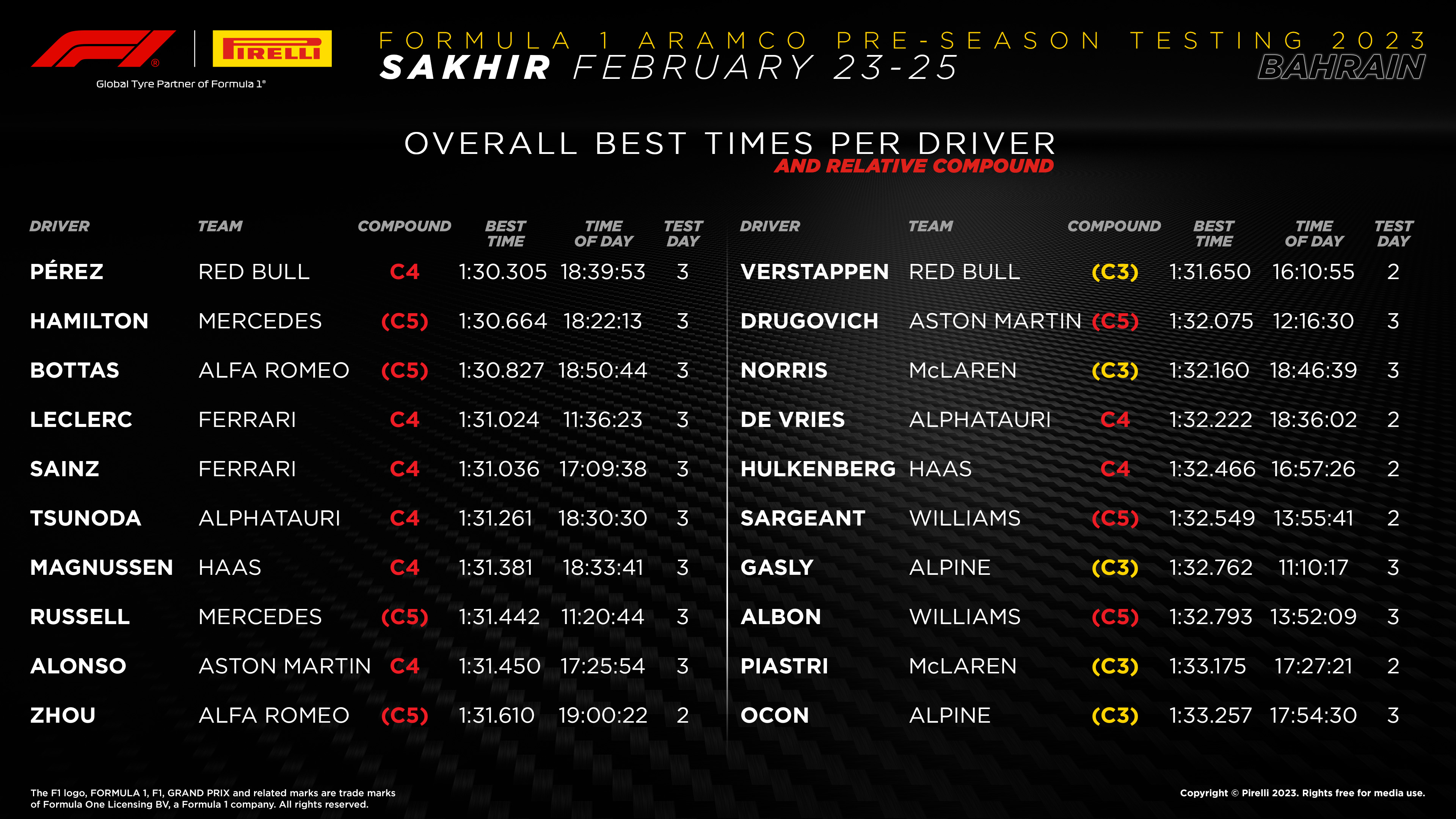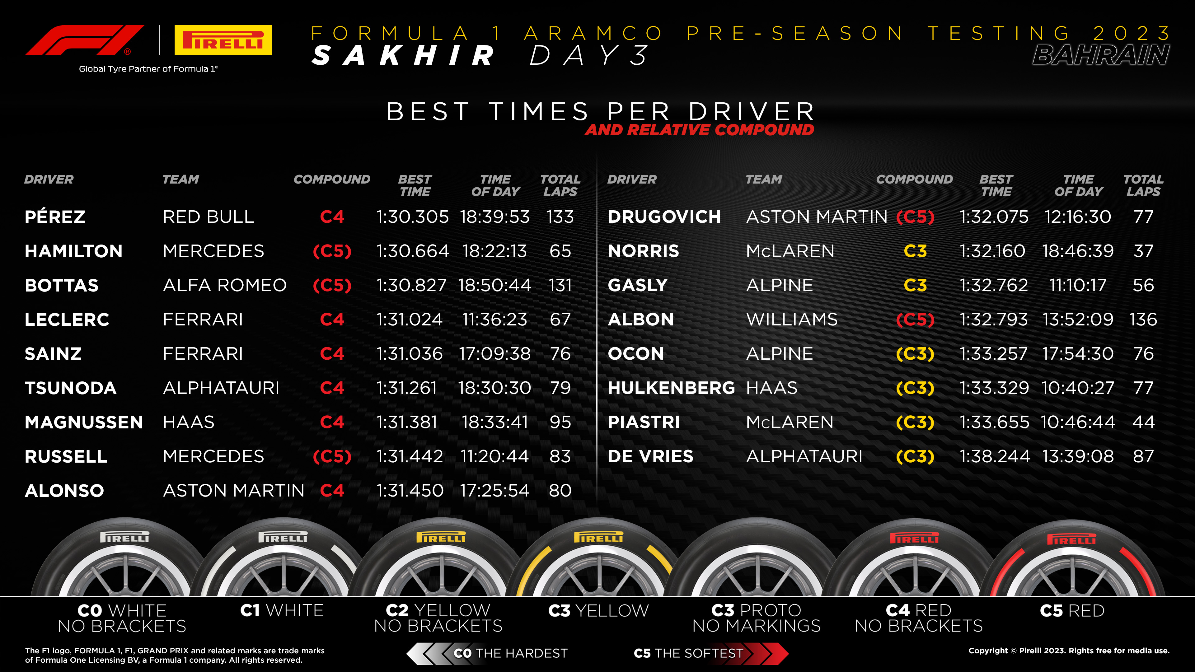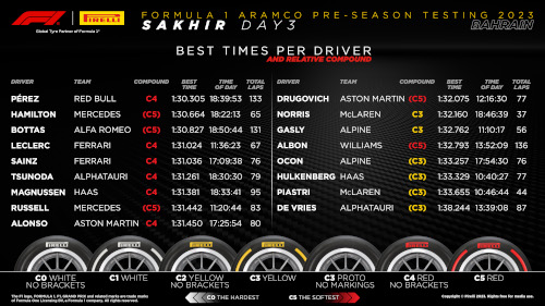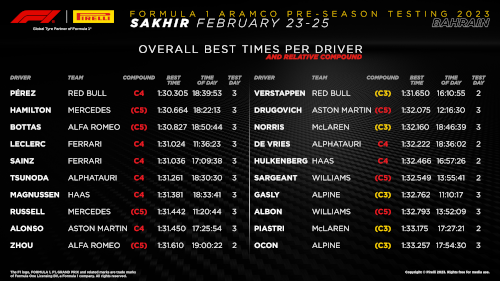 Серхио Перес с Ред Бул беше най-бърз по време на третия и последен ден от тестовете преди начелото на сезон 2023 от Формула 1. След него се нареди Люис Хамилтън с Мерцедес, а третото време записа Валтери Ботас с Алфа Ромео.