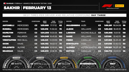 Пилотите на Мерцедес Кими Антонели и Джордж Ръсел бяха най-бързи по време на третия и последен ден от първата група тестове преди началото на сезон 2026. Третото време записа Люис Хамилтън с Ферари.
